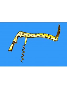 LE MONARQUE, issu de la gamme LAGUIOLE Tradition®, tout inox, plaqué or 18 carats, décor Fleur de Lys sur le manche, est une pièce d'exception qui incarne l'excellence de l'artisanat français. Identique au célèbre modèle inox brillant, ce modèle se distingue par son raffinement, son robuste tire-bouchon, sa lame à micro denture et son double levier, conçu pour une extraction sans effort des bouchons les plus récalcitrants.