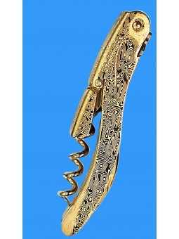 The Laguiole Tradition® sommelier, crafted entirely from stainless steel and plated with 18-karat gold, features a Damascus pattern on the handle and lever. This exceptional piece embodies the excellence of French craftsmanship. Identical to the renowned polished stainless steel model, this version is distinguished by its refined design, robust corkscrew, micro-serrated blade, and double lever, designed for effortless extraction of even the most stubborn corks.