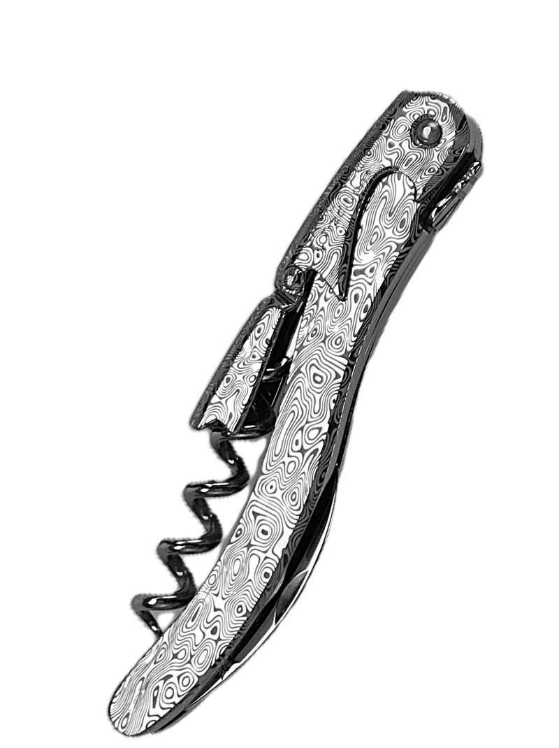 Combining elegant design with robust materials, the LAGUIOLE Tradition® sommelier's corkscrew, crafted entirely from stainless steel with a polished finish and featuring a Damascus pattern on the handle and lever, embodies the originality of French craftsmanship. This model boasts a sturdy corkscrew, a micro-serrated blade, and a double lever for easy removal of all types of corks.