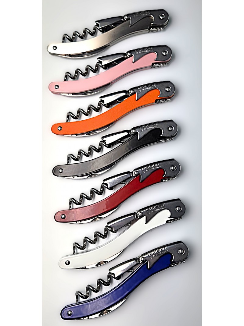 With its elegant design and pure Thiers craftsmanship, the all-metal, double-lever LAGUIOL'COLOR® is a very robust sommelier's corkscrew. Available in a multicolor version with a stainless steel handle, a sturdy corkscrew, a micro-serrated blade, and a double lever for easy removal of all corks.